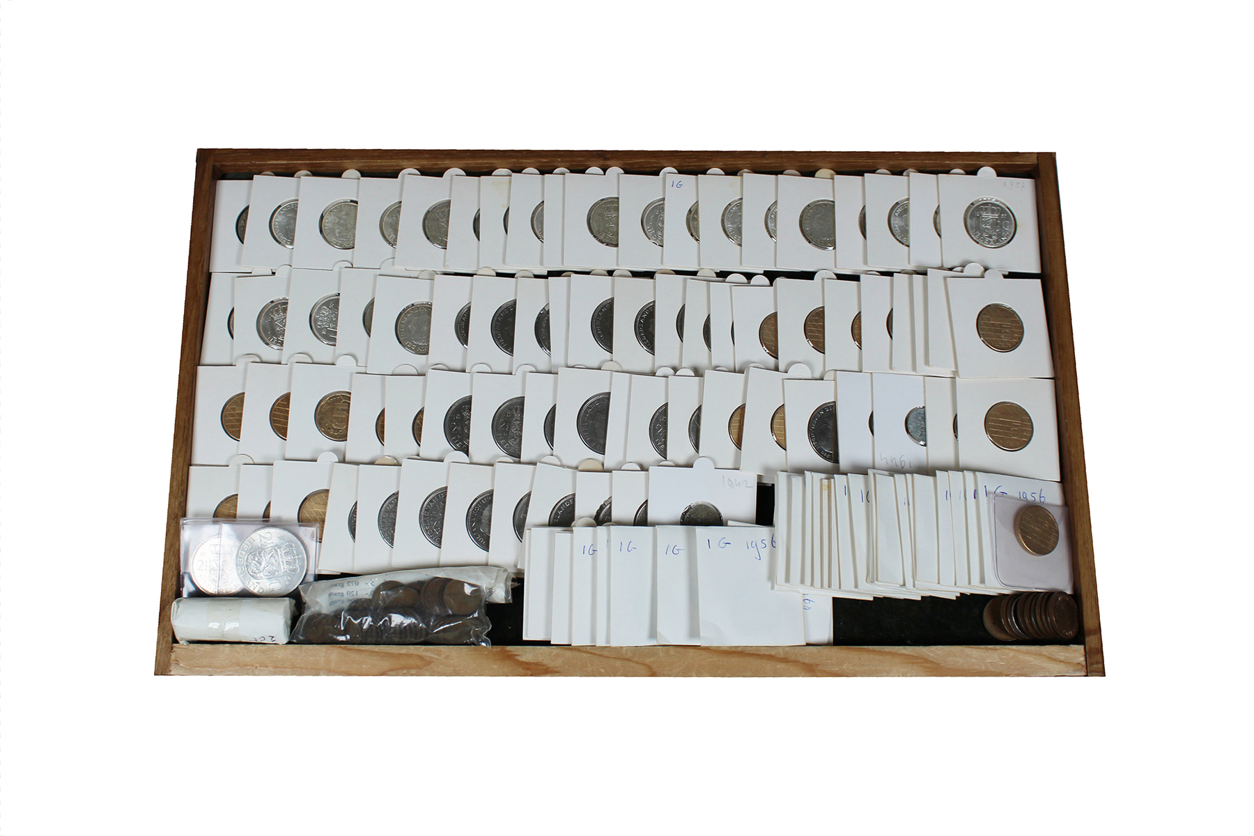 Kistje met oud Juliana nominaal waaronder ca. 55 stuks zilveren guldens 1954-1967, veel UNC.