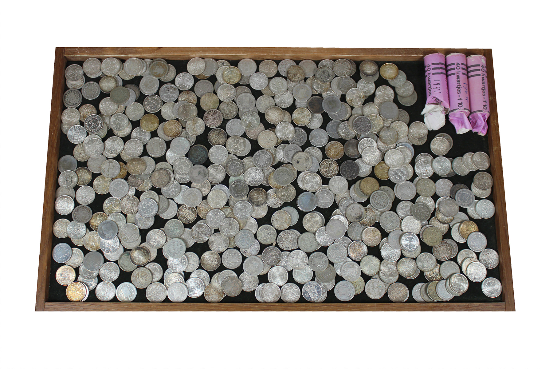 Groene sigarendoos met 1,7 kg. (bruto) ¼ Gulden Nederlands-Indië. Van fraai tot FDC.