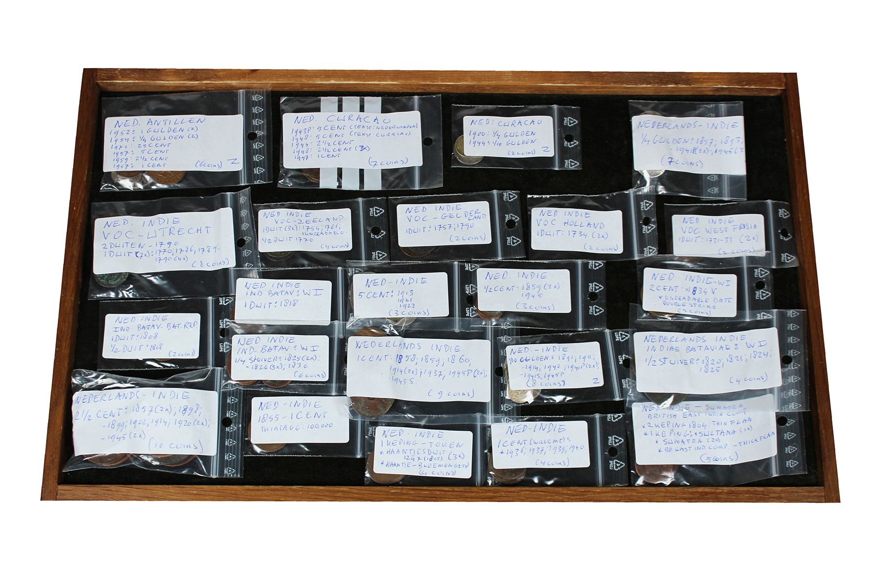 Doosje met munten Nederlands Oost- en West-Indië. Van keping tot VOC-duit en van stuiver tot en met zilveren gulden. O.a. 1 cent Nederlands-Indië 1855.