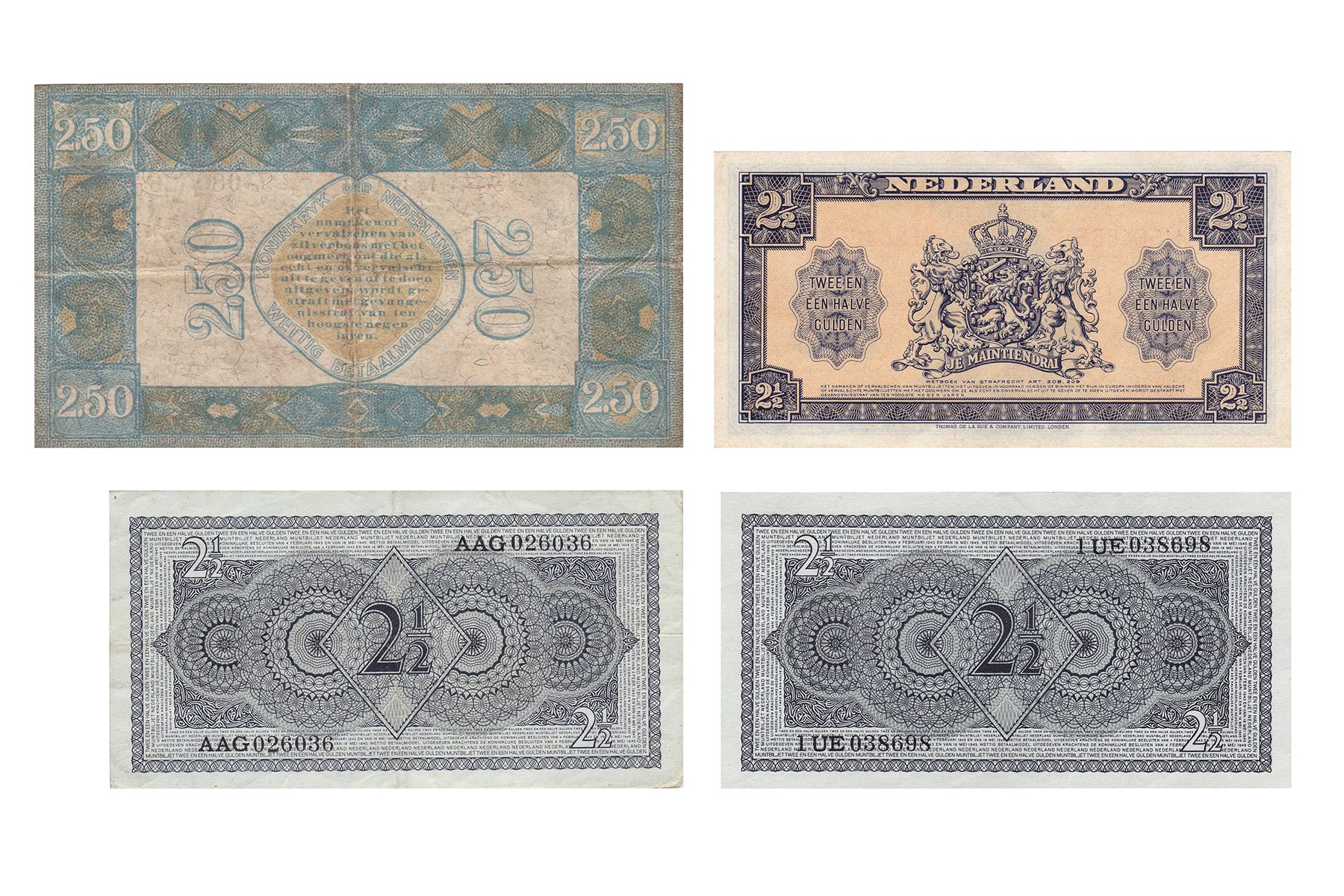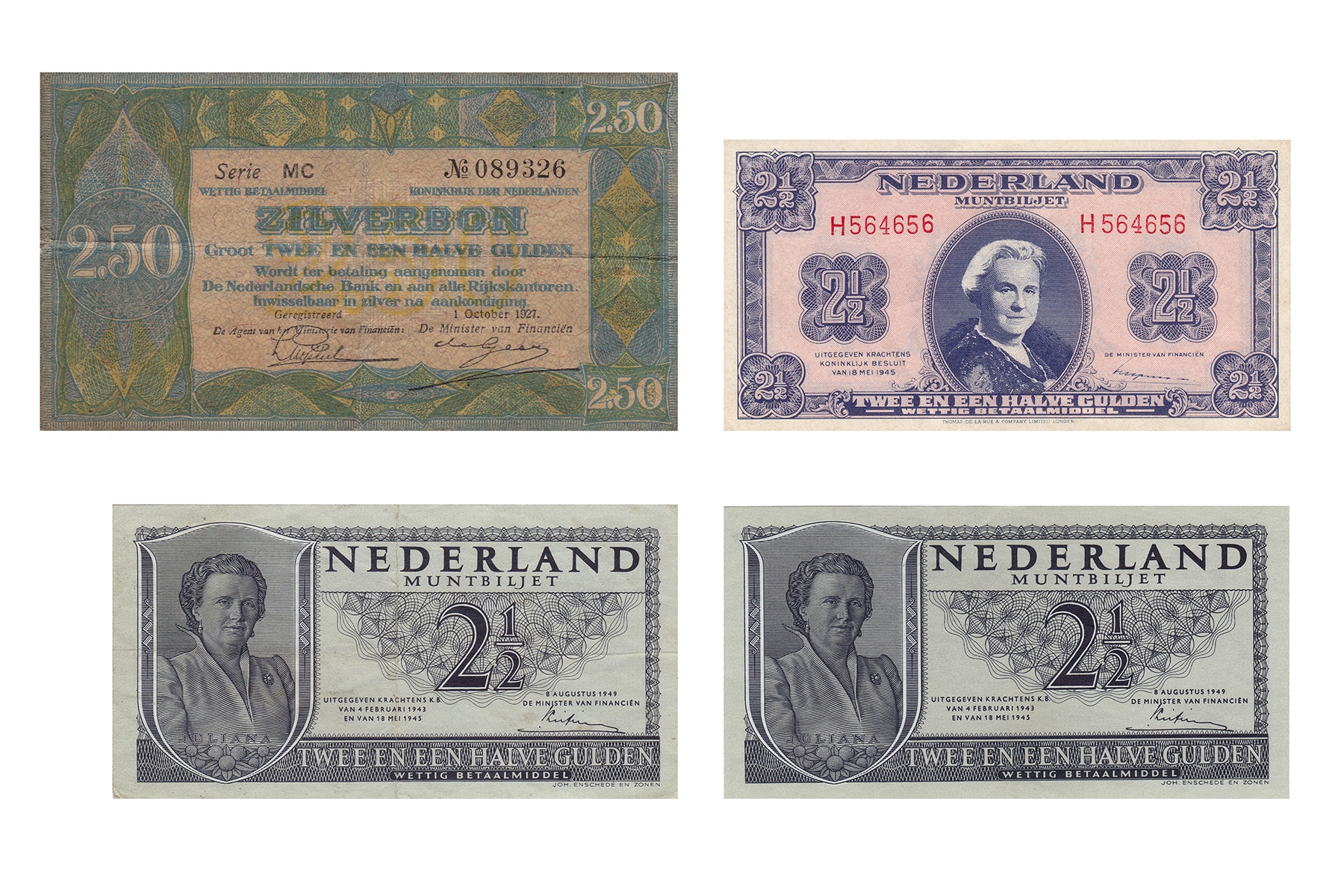 Lot (4) 2 ½ Gulden 1927, 1945 en 1949 (2 varianten). Mev. 12-4, 15-1a, 16-1ab; PL 13.d, PL 16a1, PL17ab. Fraai tot UNC.