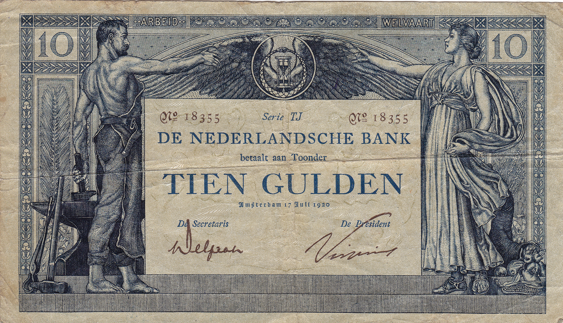 10 Gulden 17-07-1920 Arbeid en Welvaart II. Mev. 36-4b; PL 31.e2.b [# TJ 18355]. Fraai.