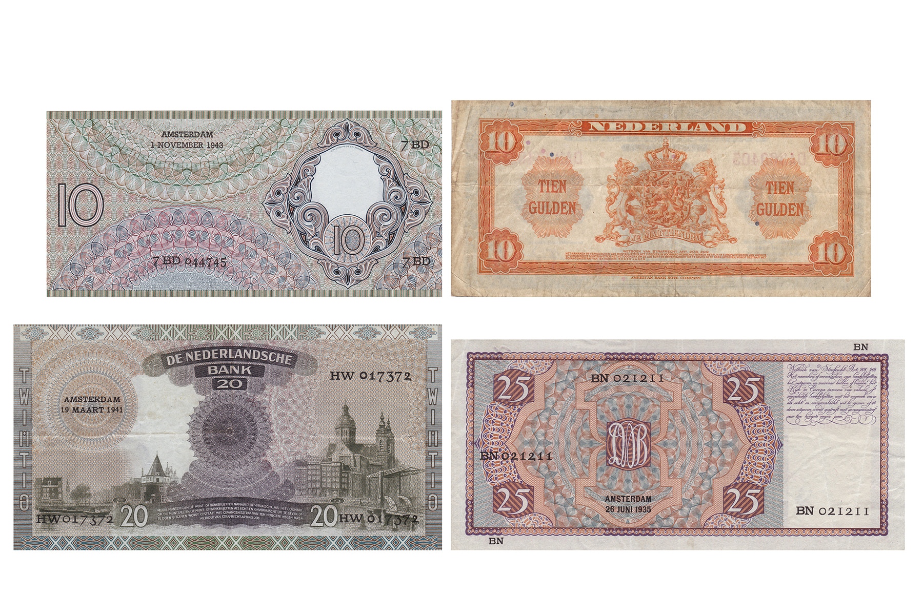 10 Gulden 1939 Emma; 10 Gulden 1943 (2) Staalmeester, Emma II; 25 Gulden 1931 Mees. Mev. 58-1, 43-1, 44-1, 76-1; PL 51, 40, 41, 61. Gemiddeld zeer fraai.