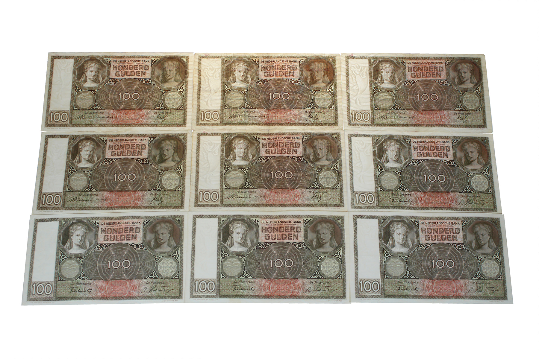 Lot (9) 100 Gulden 1930. In verschillende varianten. Ruim fraai / Zeer fraai.