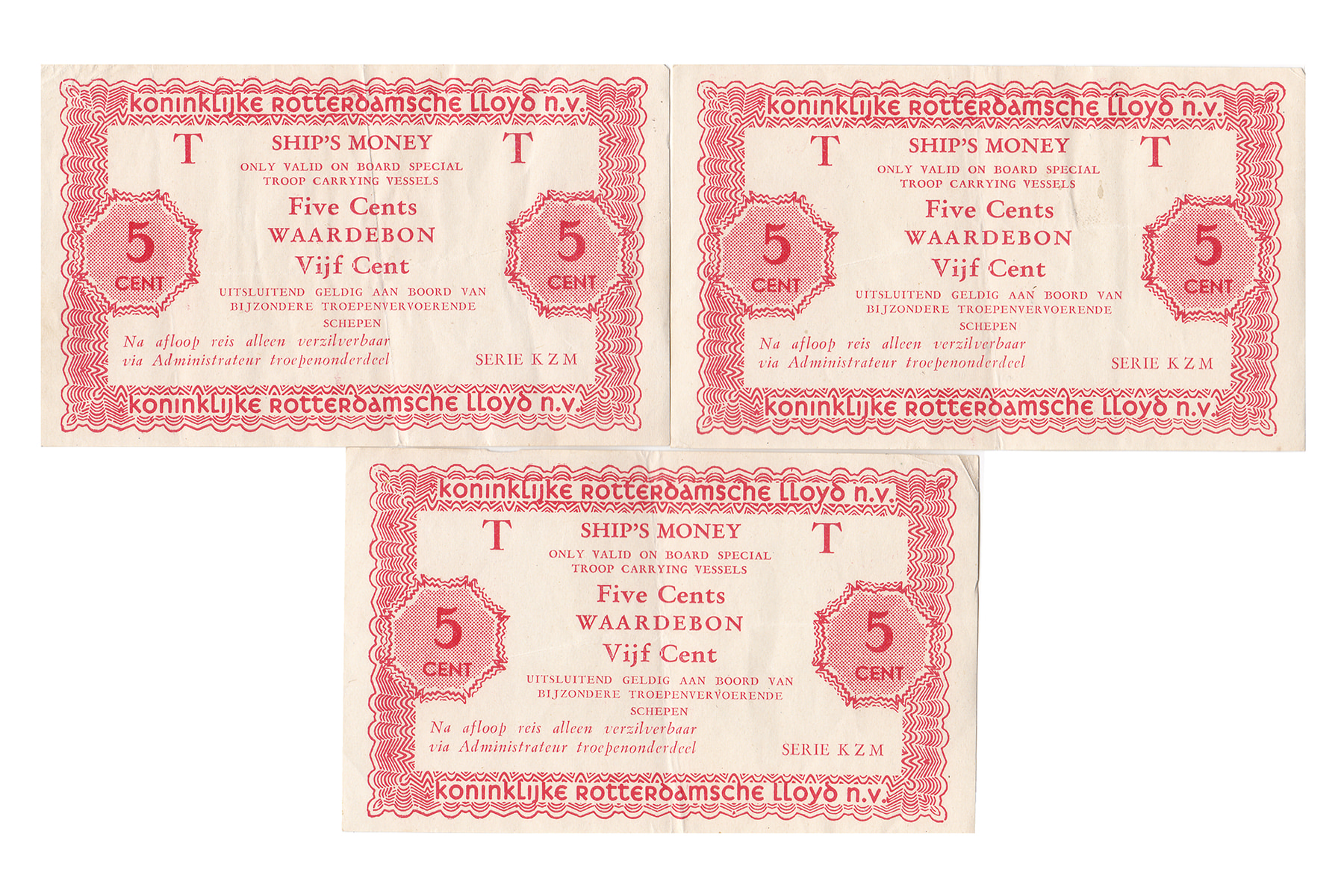 Lot (3) Scheepsgeld Kon. Rotterd. Lloyd; 5 cent 1947 Serie T-KZM. PL 1610.1.a2. Zeer fraai / Prachtig.