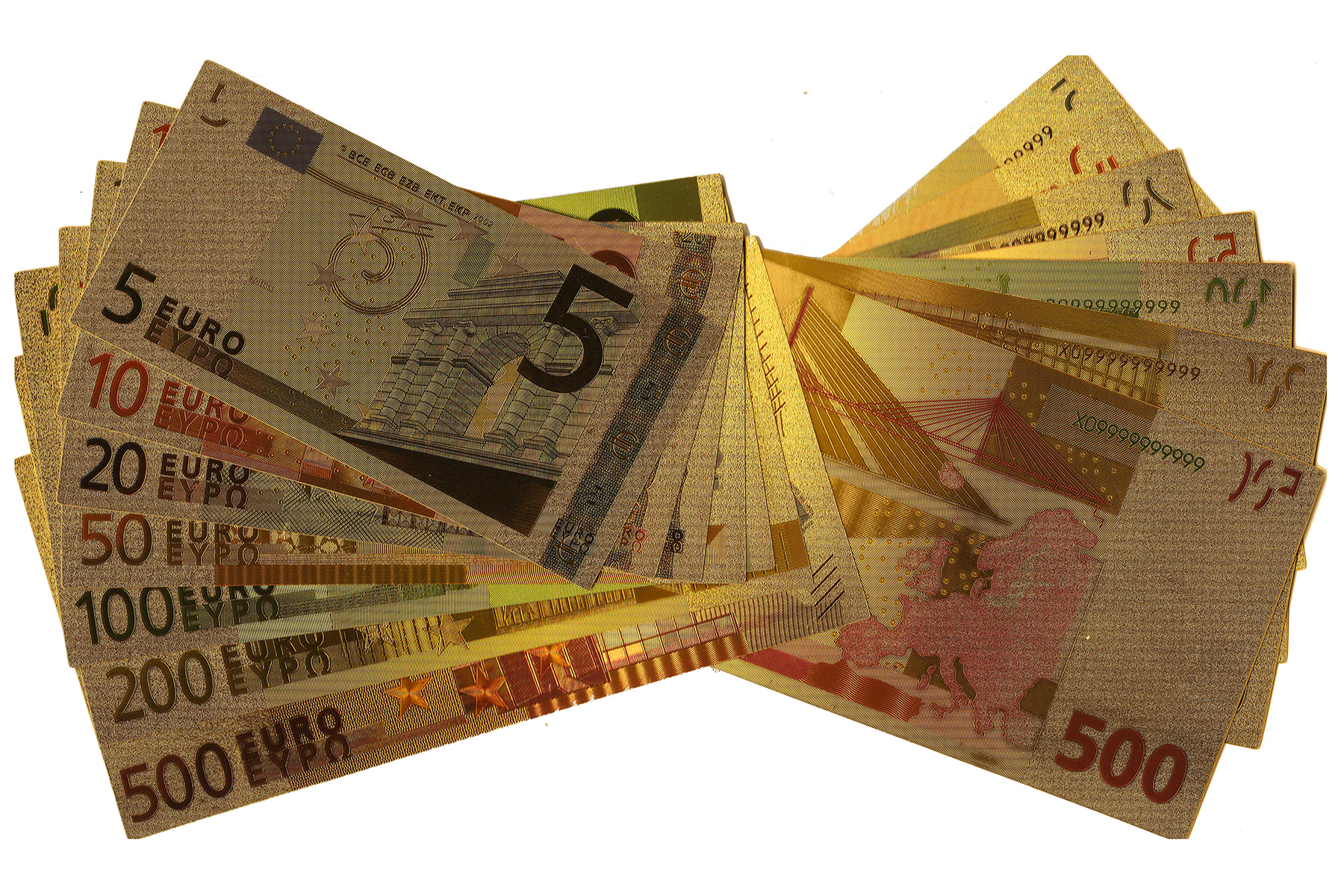 Lot (2) complete serie € 5 t/m € 500 2002 goudkleurig uitgevoerd. Leuk voor in de etalage!