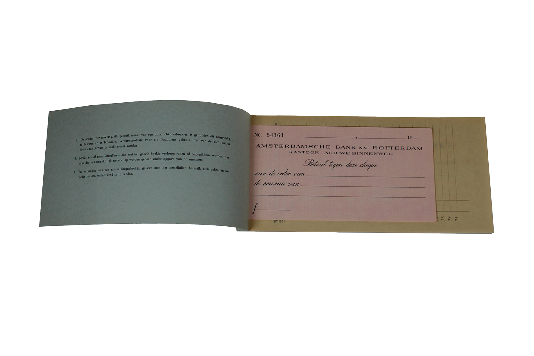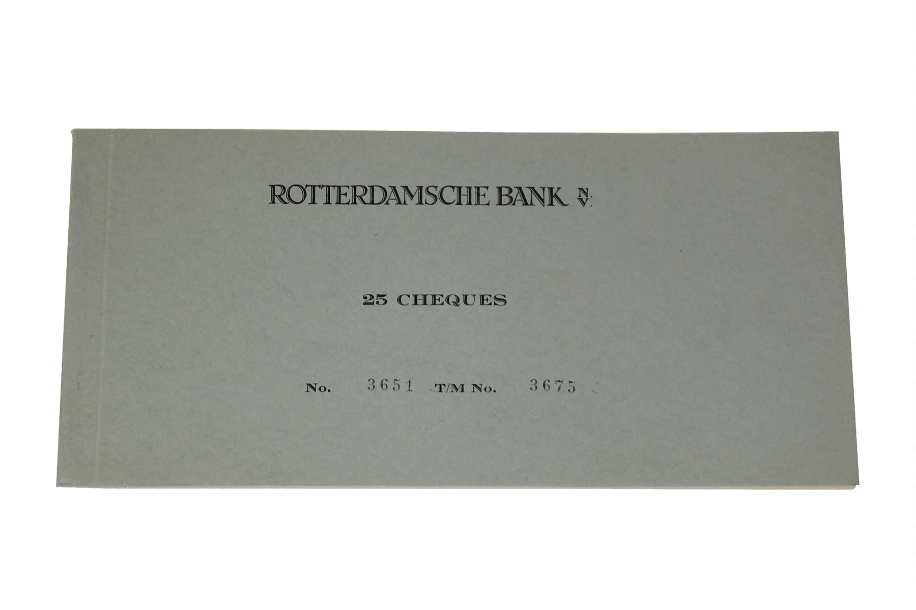 Chequeboekje van de Rotterdamsche Bank NV. No. 3651 t/m 3675. Curieus!