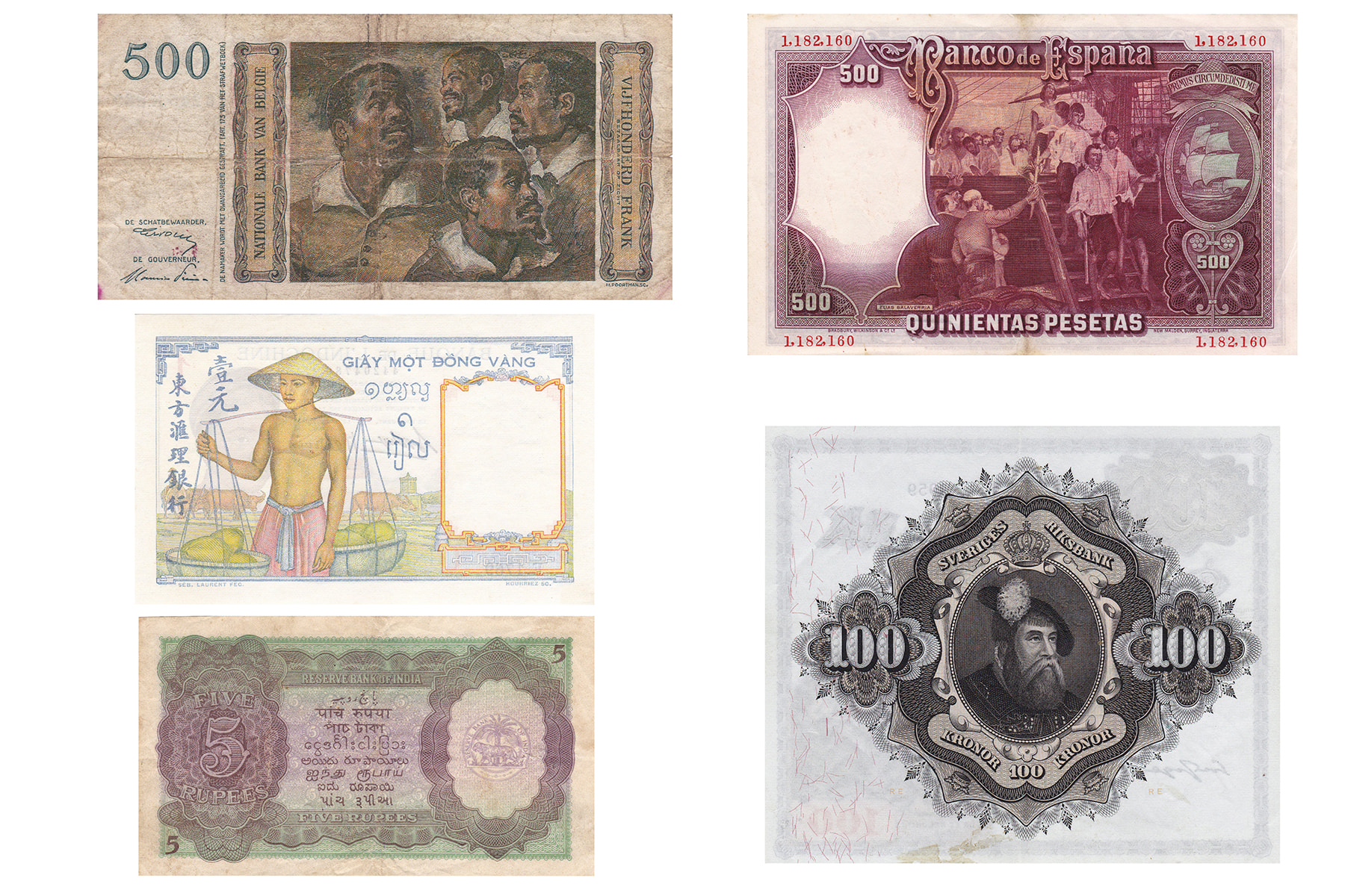 Lot (5) diverse betere wereldbiljetten. België: 500 Francs 1952. Pick 130 [# 0245.K.669]. VG; French Indo Chine: 1 Piastre n.d. (1932). Pick 52 [# E.1769 786. Almost UNC; India: 5 Rupees ND. Pick 18b [# 096176 ]. VF; Spanje: 500 Pesetas 1931. Pick 84 [# 1.182.160]. VF; Sweden: 100 Kronor 1959. Pick 48 [# Q 315777]. Stains reverse. Almost UNC. Verschillende kwaliteiten.