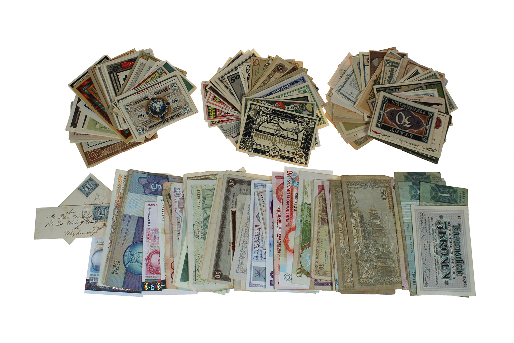 Platte Bamigo doos met leuk onuitgezocht bankpapier wereld, ondermeer noodbiljetten.