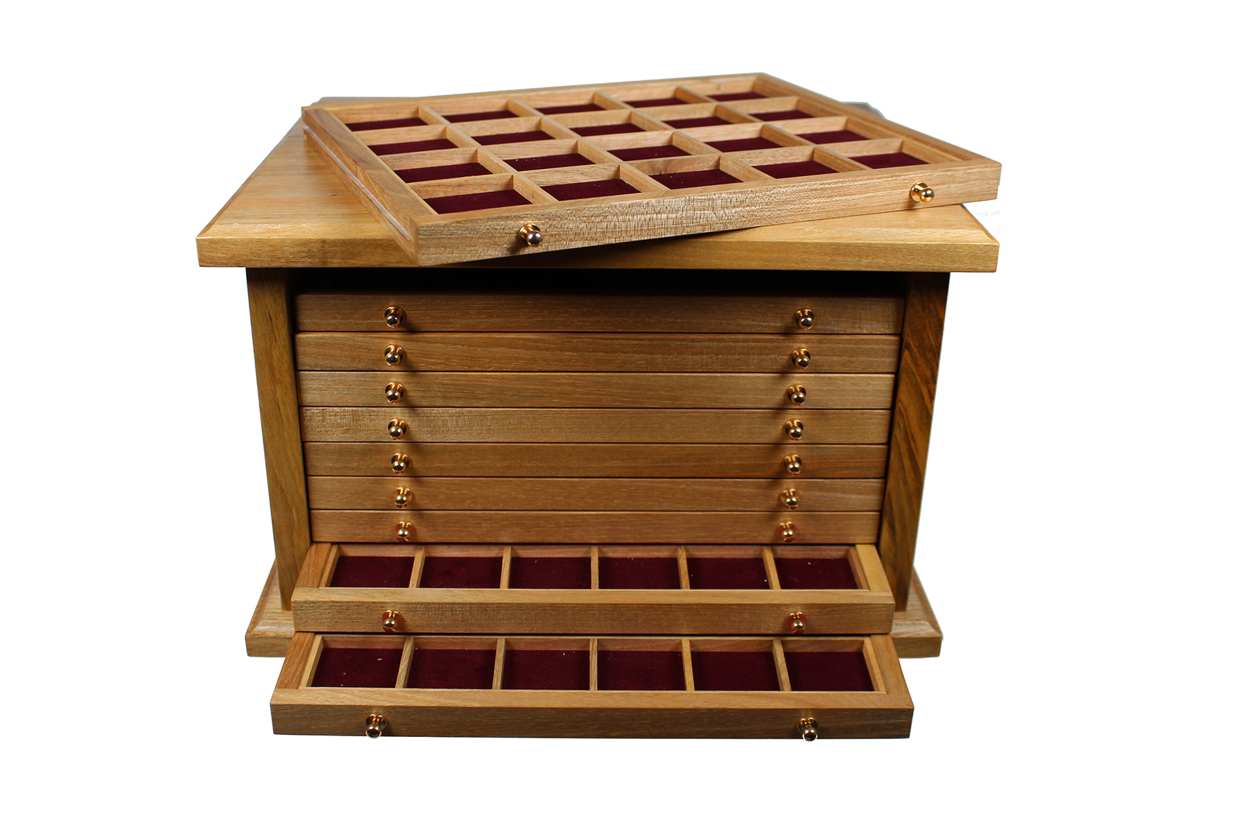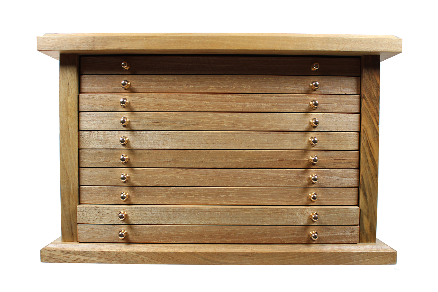 Huisvlijt. Leuk houten ladekastje met 10 lades om munten en/of penningen in op te bergen. Afmetingen: 33,5 x 24 x 19,5 cm. ⁂