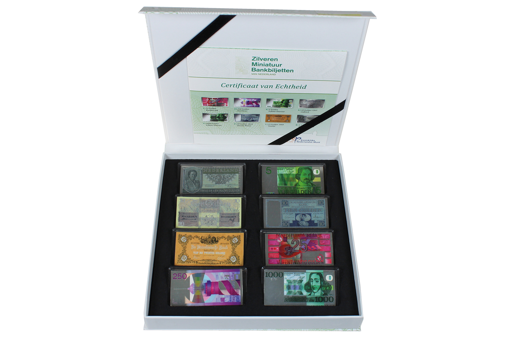 Zilveren miniatuur bankbiljetten zilver in bi-colour. Leuk voor wie heimwee heeft naar de guldentijd! ⁂