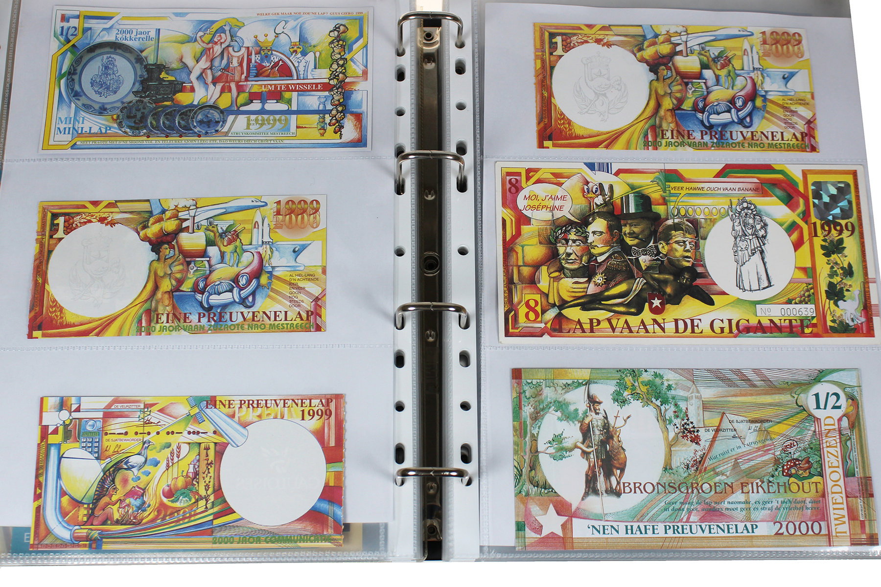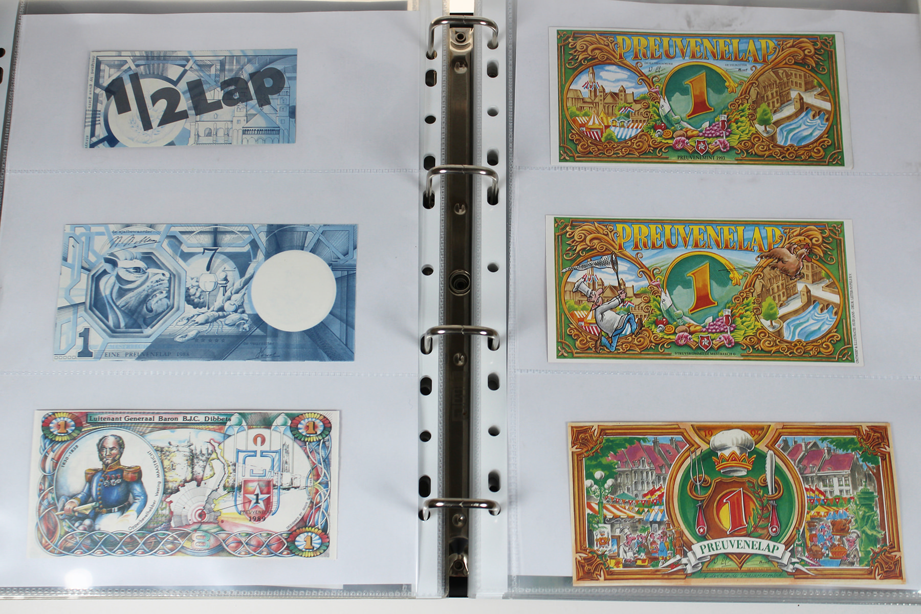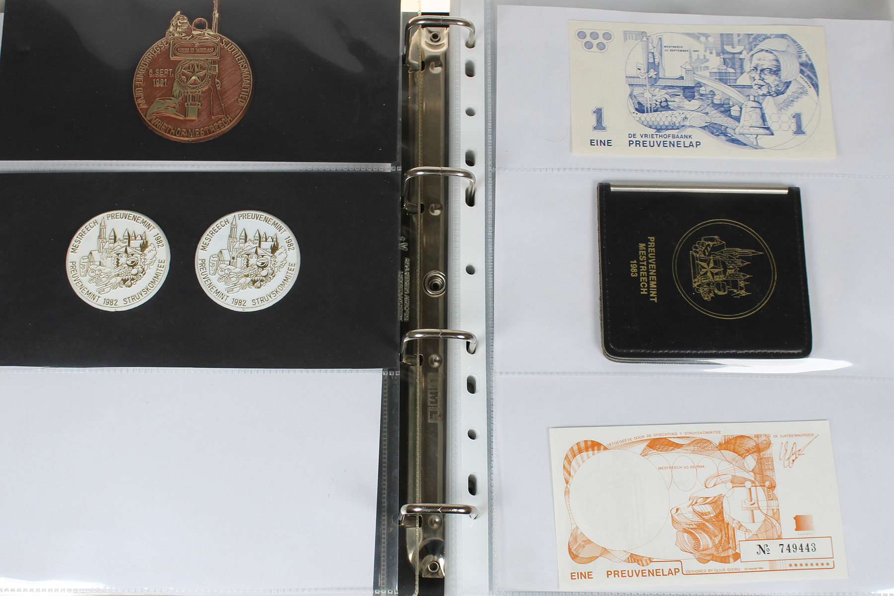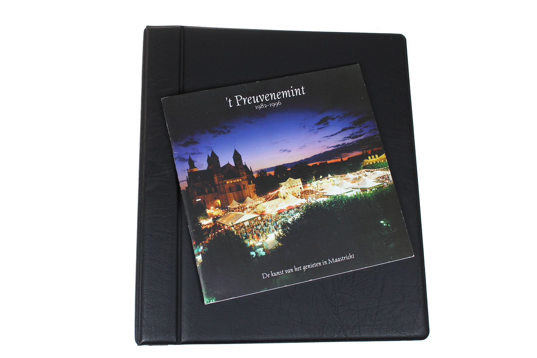 Maastrichtenaren opgelet! Zwarte opbergband met een vrijwel complete collectie Preuvenelappen t.b.v. ’t Preuvenemint in Maastricht. Leuk! ⁂