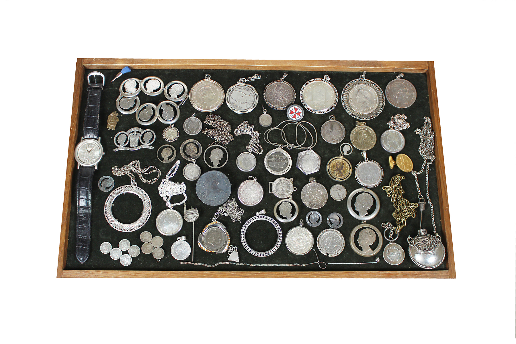 Sigarenkistje allerlei sieraden, meeste van zilver, meest uit munten vervaardigd. Brutogewicht: 660 gr.
