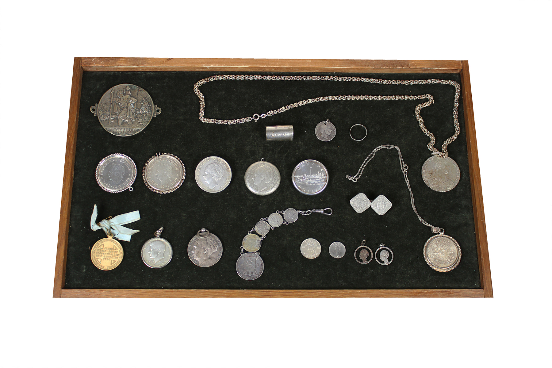 Sigarenblikje met allerlei brick en brack. Ook zilver!