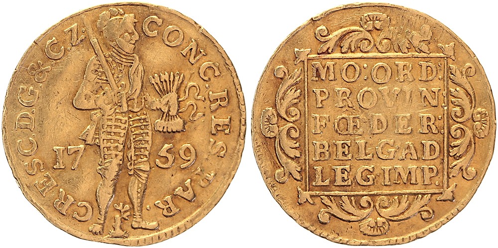 Dukaat 1759. Delm. 650; CNM 2.17.82; HPM 48 [3,40 gram]. Zeer fraai.
