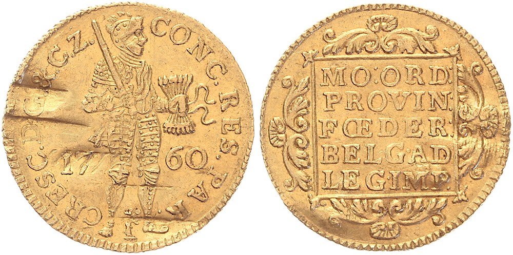 Dukaat 1760. Delm. 650; CNM 2.17.82; HPM 48 [3,46 gram]. Duidelijke klemsporen, overigens ruim zeer fraai