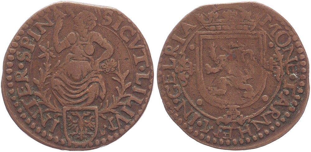 Duit z.j. (1596-1598) Arnhem. PW 1201. Zeer fraai.