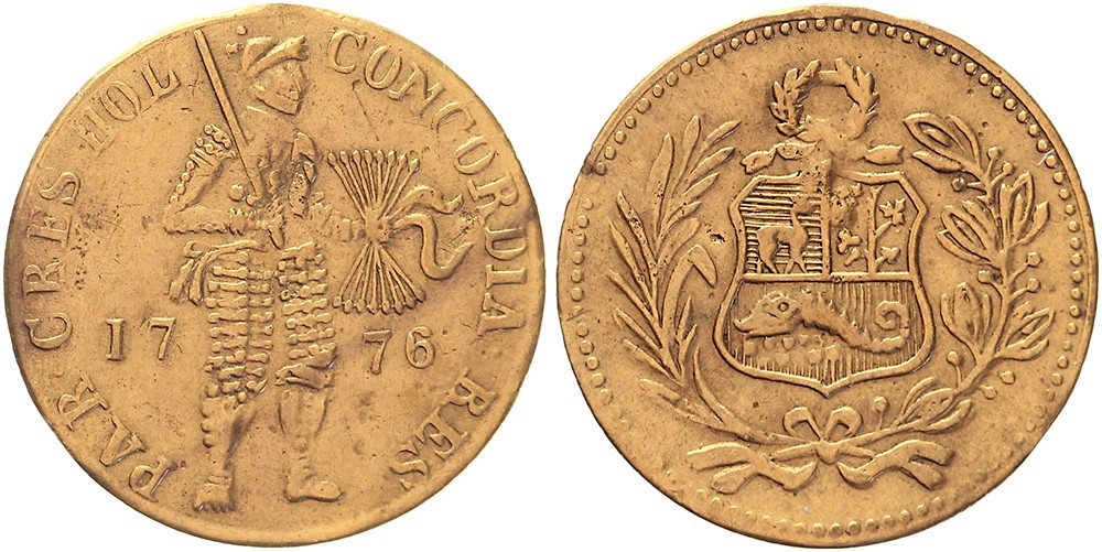 Dukaat 1776. Vervalsing in messing (?) met op de keerzijde het wapenschild van Peru. Uiterst curieuze combinatie. Verwijderd draagoog? Zeer fraai.