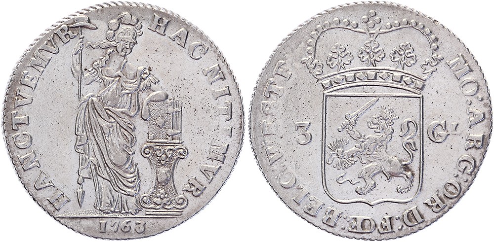 3 Gulden 1763, geen mmt. Delm. 1147; CNM 2.46.55; HPM 46. Mooi kleurtje. Zeer fraai / prachtig.