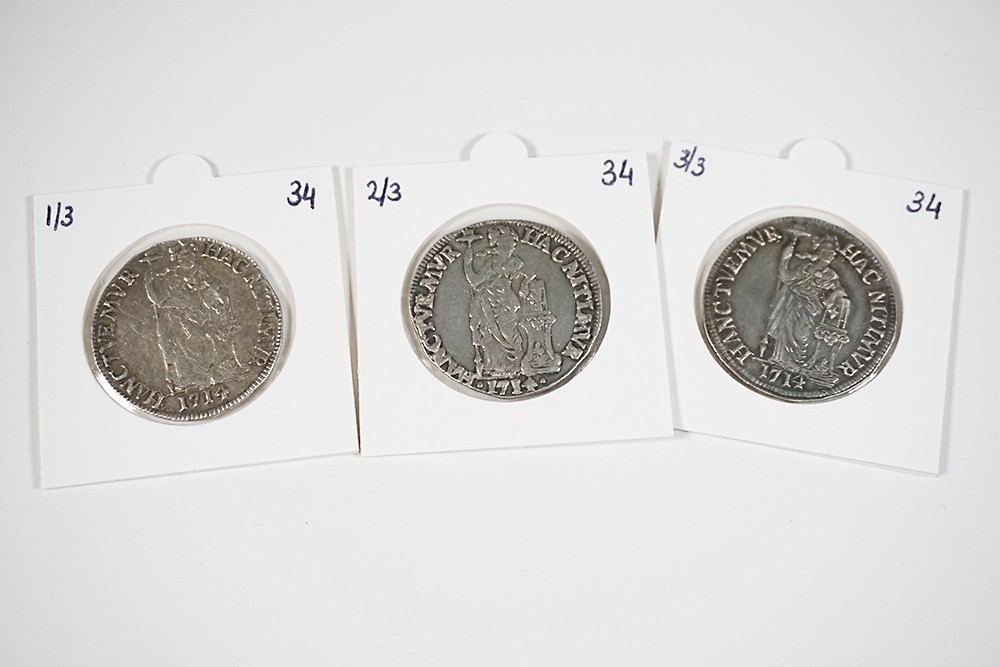 Lot (3) 1 Gulden 1714. Drie verschillende stempels! Delm. 1180; CNM 2.46.56; HPM 48. Circa zeer fraai.