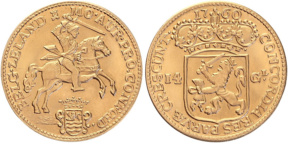 Rijder of 14 gulden 1760. Naslag uit de jaren ’60 van de 20e eeuw op het formaat van een ½ gouden rijder [Ø 22½ mm., gladde rand, 6,70 gram]. Prachtig.