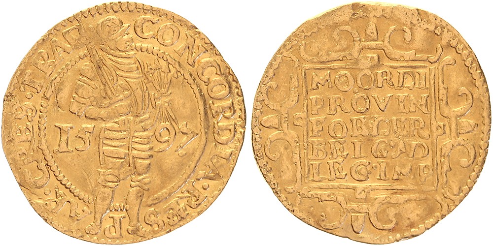 Dukaat 1597, vijf pijlen in bundel. Delm. 963; CNM 2.43.42; HPM 24 [3,44 gram]. Zeer fraai.