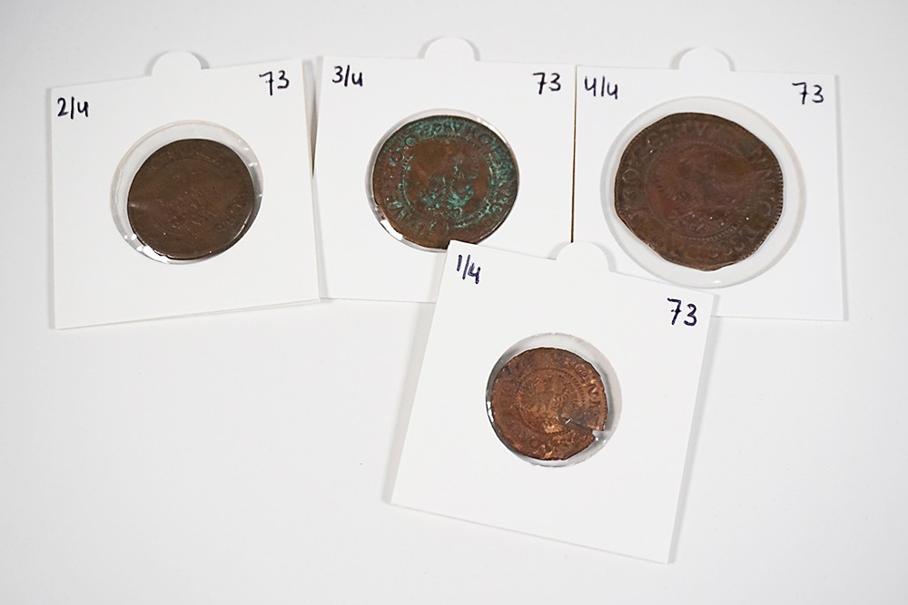 Lot (4) Serie noodmunten emissie 30 oktober 1578. ½ stuiver, 1 stuiver, 2 stuiver en 4 stuiver (1578). Allen met klop. CNM 2.12.88 t/m 91; FD 74-77. Zeer fraai.