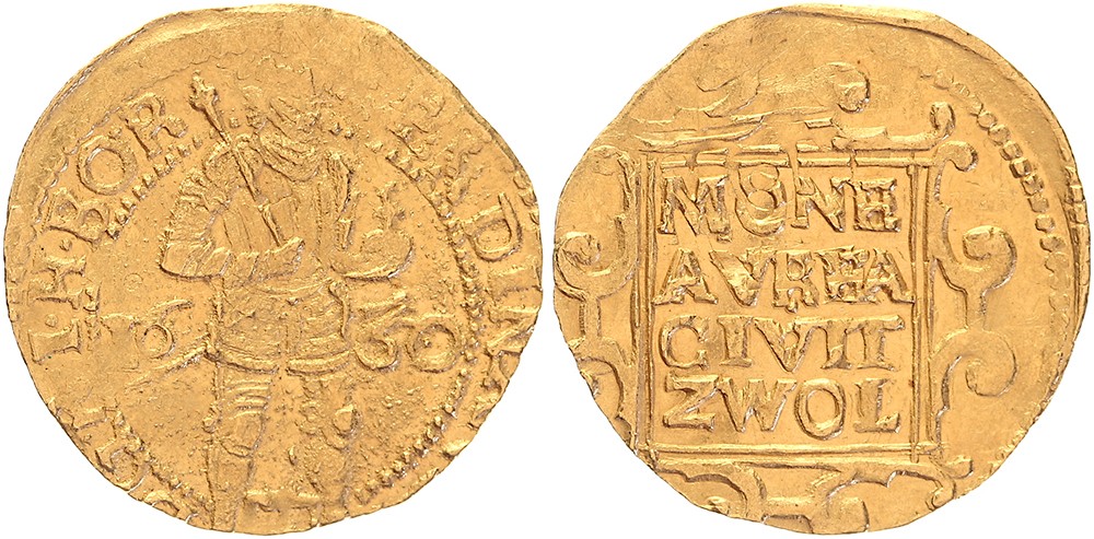 Gouden dukaat 1660 op naam van Ferdinand III. Delm. 1133; CNM 2.52.26; HPM 11 [3,46 gram]. Excentrisch geslagen en behoorlijk pokdalig. Circa fraai.