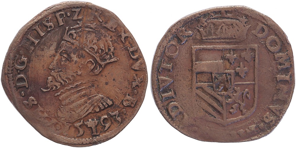 Oord 1593 ‘s-Hertogenbosch. GH 232-4b. PW 9208. Met DVX • B in omschrift. Krasje op voorzijde. Zeer fraai.
