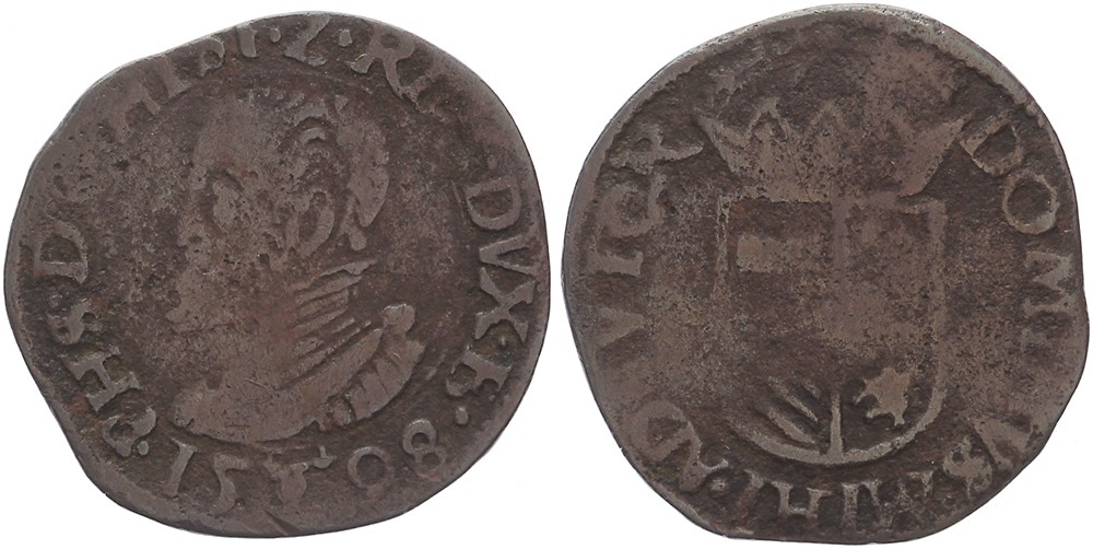 Duit 1598 ‘s-Hertogenbosch. GH 233-4c; PW 9206. Met HISP • Z • REX in omschrift. Fraai.