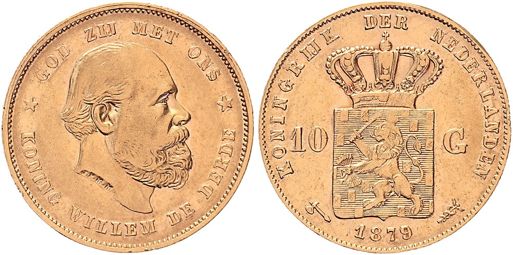 10 Gulden 1879 uit 1877 mmt. bijl Sch. 552a Zeer fraai