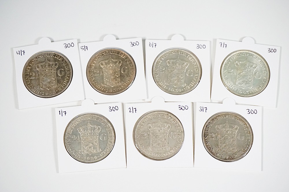Lot (7) Rijksdaalder 1929, 1930, 1932, 1933, 1938, 1939 en 1943DSch. 784, 785, 787, 788, 790, 791 en 1072. Deels gepatineerd