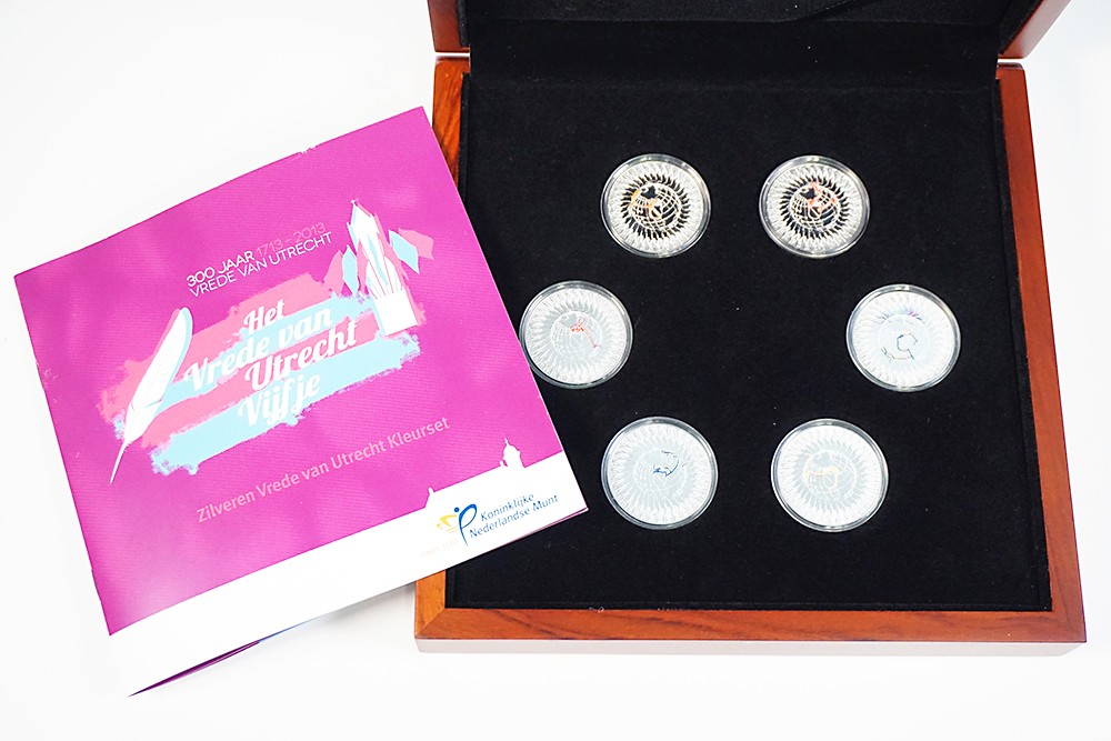 Zilveren Vrede van Utrecht Kleurset 2013, 6x 5 euro proof ingekleurd, in originele verpakking KNM.