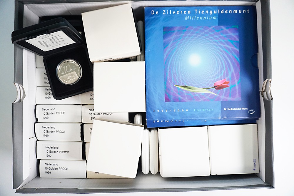 Grote schoenendoos (49) zilveren 10-gulden herdenkingsmunten in FDC en proof. Allen in originele verpakking. Netto zilver: 622 gram.
