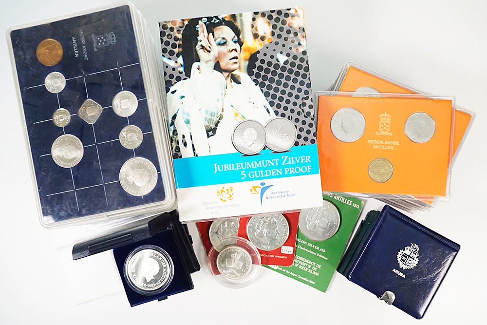 Witte schoenendoos met FDC-sets en zilveren herdenkingsmunten Ned. Antillen & Aruba.