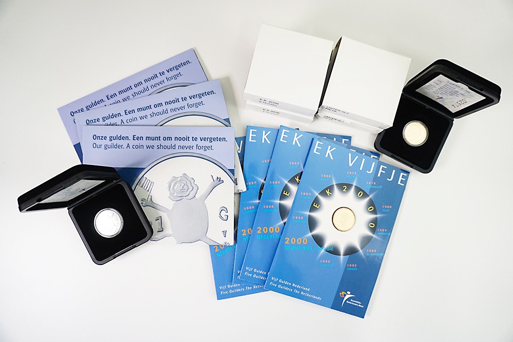 Lot (12) o.a. 6 x EK-vijfje waaronder twee stuks met klein mmt., en 6 x laatste gulden Tim van Melis, in FDC en proof.