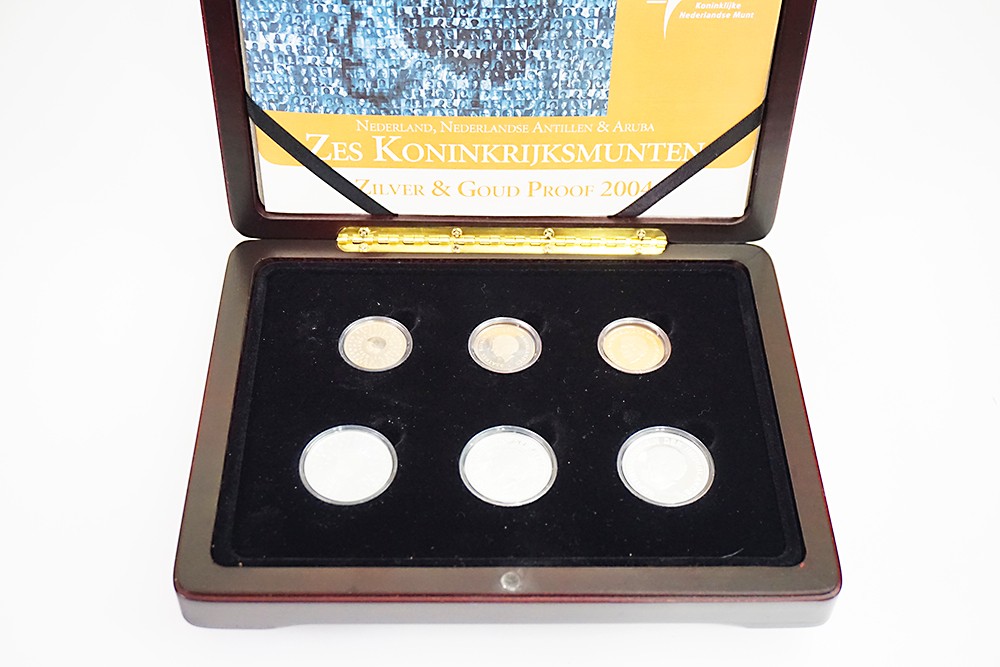 Prestigeset 2004 “koninkrijk”; bevat 6 munten: Nederland 5€ zilver en 10€ goud; Aruba 5 florin zilver en 10 florin goud; Ned. Antillen 5 gulden zilver en 10 gulden goud; in originele cassette. Proof.
