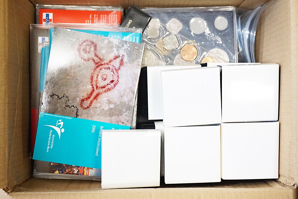 Doos met restpartij overzeese gebiedsdelen, o.a. met zilveren herdenkingsmunten en FDC-sets van Aruba / Ned. Antillen / Suriname.