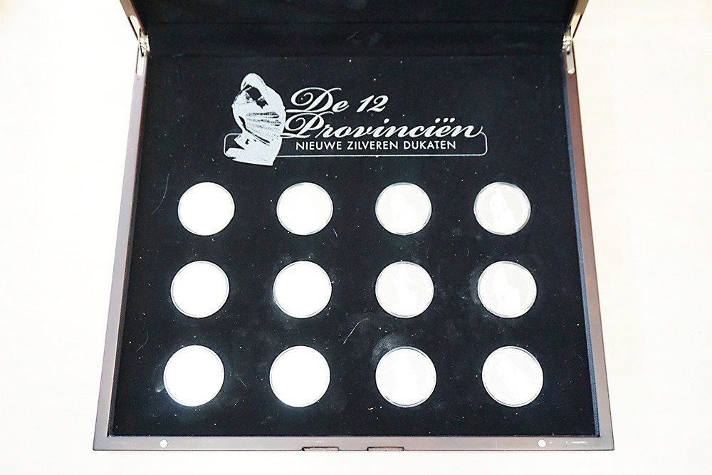 Complete serie “ De 12 Provinciën”; bevat 12 zilveren dukaten geslagen in 2008 t/m 2014 met certificaten, in originele cassette KNM. Proof.