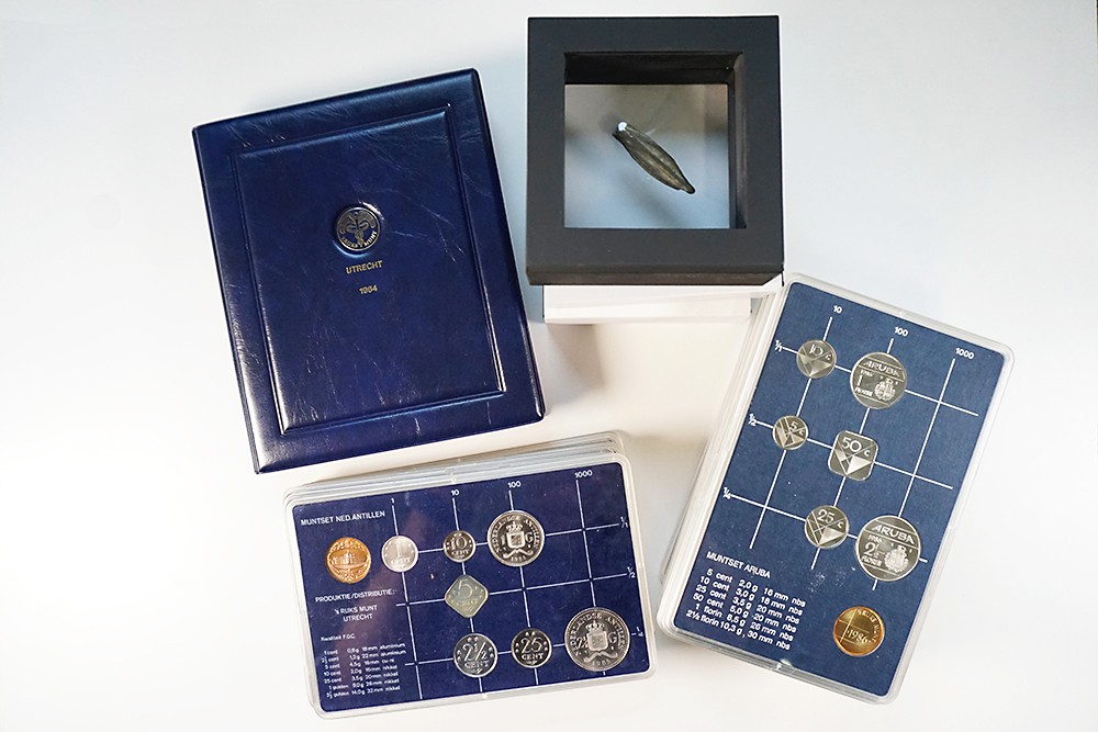 Doos met hardplastic FDC-sets NL 1982-1986 (20x); Aruba 1986 (4x); Antillen 1983-1985 (9x). Toegevoegd: proofset 1984, 1985 en drie presentatieboxen “Schatvondst Gellicum” – “Pijlpuntgeld uit het oude Istros”- “Ringgeld van Siam”. Alles origineel ’s Rijks Munt/KNM.