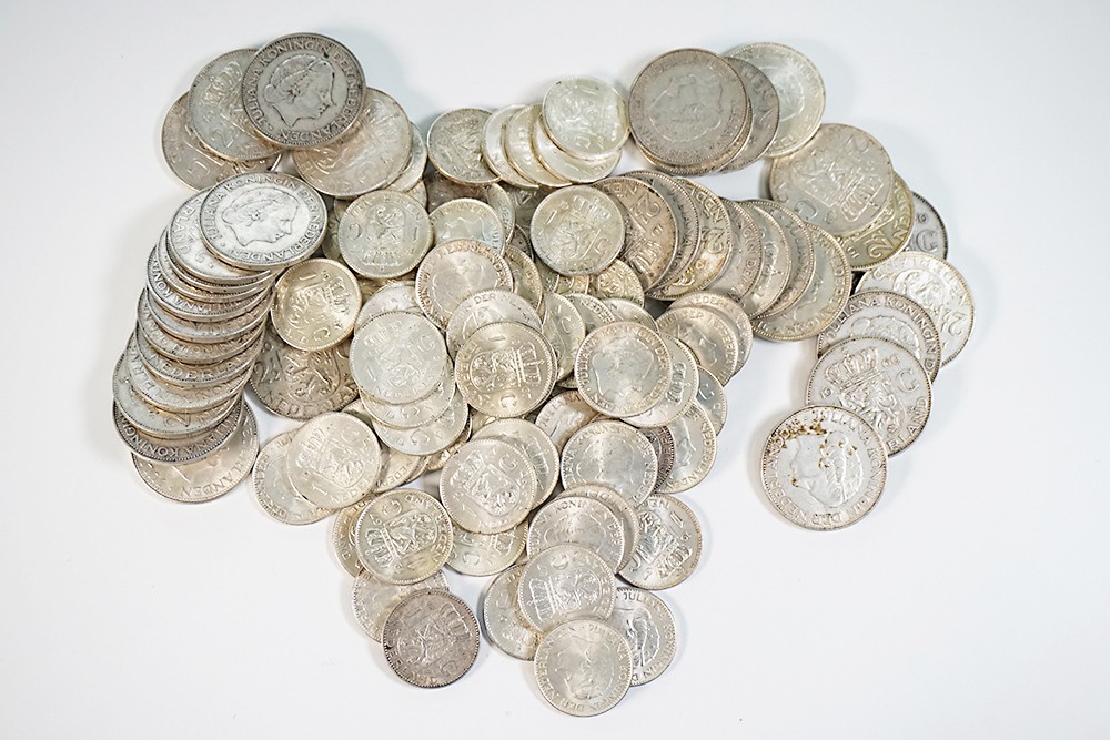 Sigarenkistje Juliana zilvergeld: 68 x 1 Gld. + 36 x Rijksdaalder.