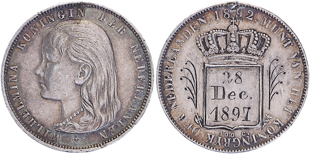 1 Gulden 1892 waarvan de keerzijde op fraaie wijze is bewerkt in het wapen staat 28 Dec 1897. Zeer fraai.