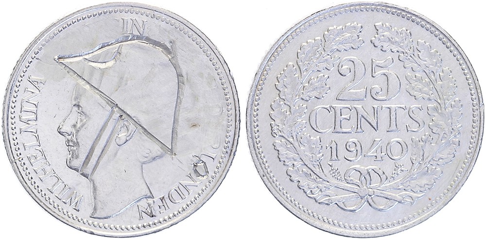 25 Cent 1940 Wilhelmina in Londen, mooi gehelmd exemplaar! Zeer fraai.