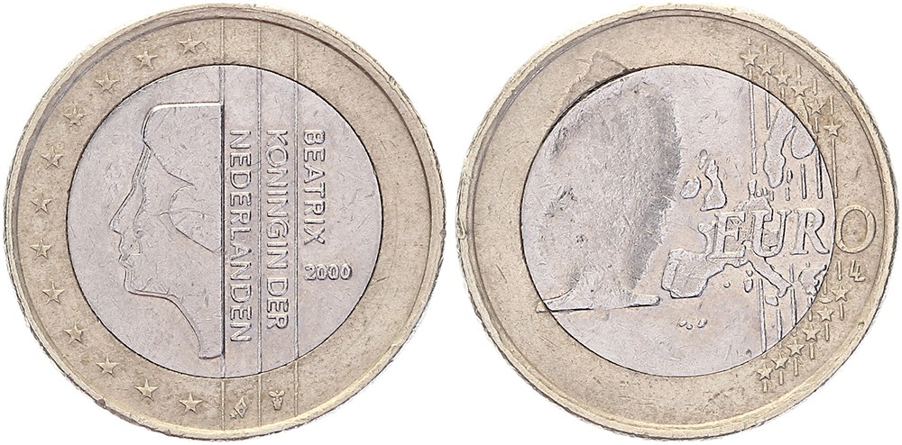 1 Euro 2000 (NL) met duidelijke productieschade aan het muntplaatje, waardoor 1 euro niet meer leesbaar is. Zeer fraai.