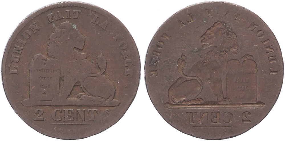 België. 2 Centimes z.j. (type 1833-1876). Zittende leeuw op vz. en incuus op kz. [3,20 gram]. Fraai.