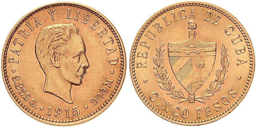 5 Pesos 1915 Marti. Fr. 4; KM 19. Unc.