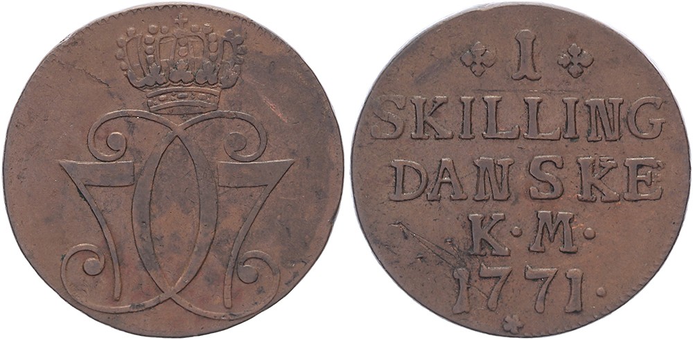 1 Skilling 1771 (Ø 29,7 mm. – weight: 11,77 gr. – DANSKE reverse). VF.