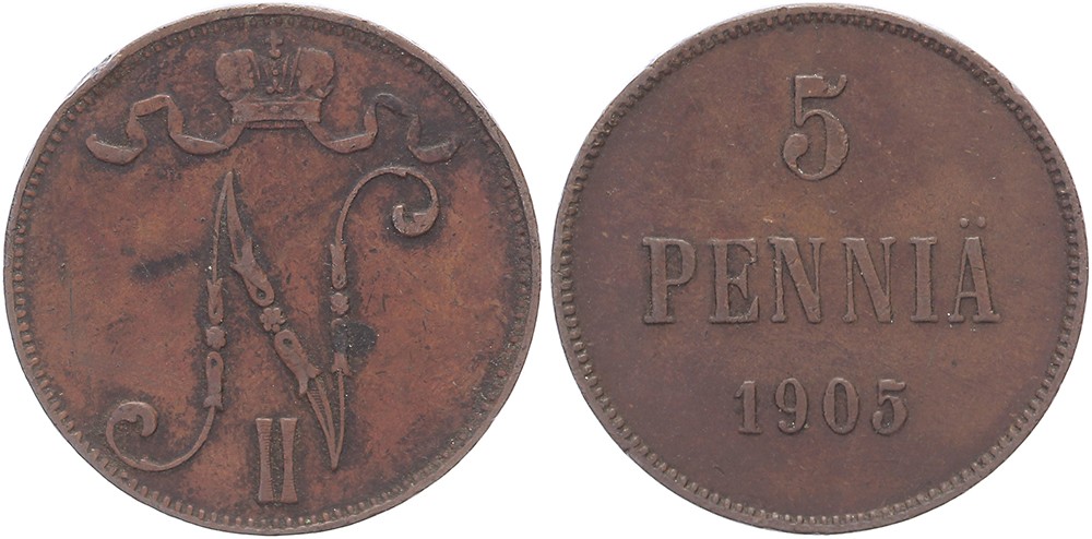 5 Penniä 1905. KM 15. VF / EF.