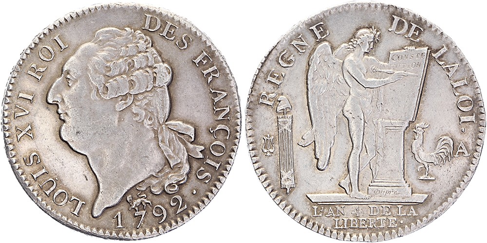 Écu de 6 livres 1792A (Paris). Louis XVI). Gad. 55; KM 615.1. TTB (VF).