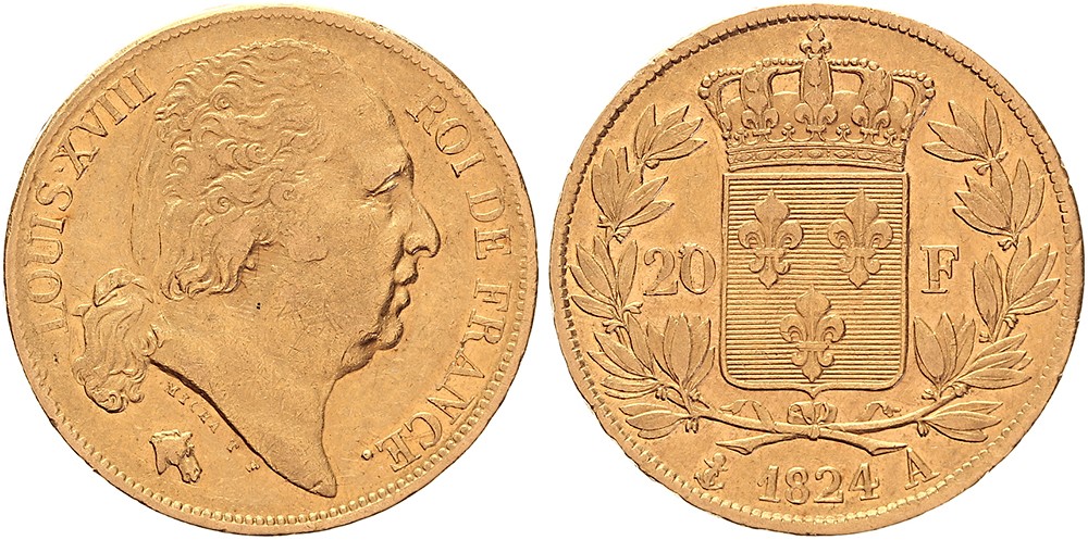 20 Francs 1824A (Paris). Fr. 538; Gad. 1028; KM 712.1. TTB (VF).