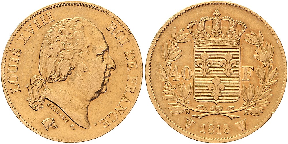 40 Francs 1818W (Lille). Fr. 536; Gad. 1092; KM 713.6. TTB (VF).